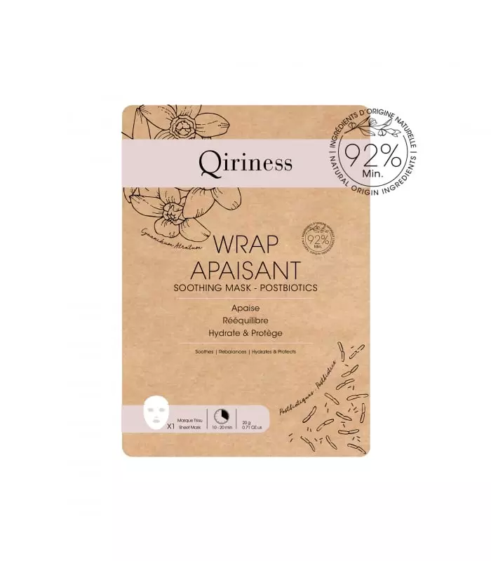 Reconnus pour leurs propriétés rééquilibrantes et régénérantes, les Postbiotiques apaisent et protègent les peaux sensibles et réactives des agressions extérieures. Avec sa formule enrichie en Postbiotiques, auxquels s’ajoutent des extraits de Cynanchum Atratum et de racine de Réglisse, le Wrap Apaisant calme les peaux tiraillées et leur apporte du confort. Son effet seconde peau vous offre un maintien parfait sur le visage pour une diffusion optimale de ses actifs au cœur de votre peau.