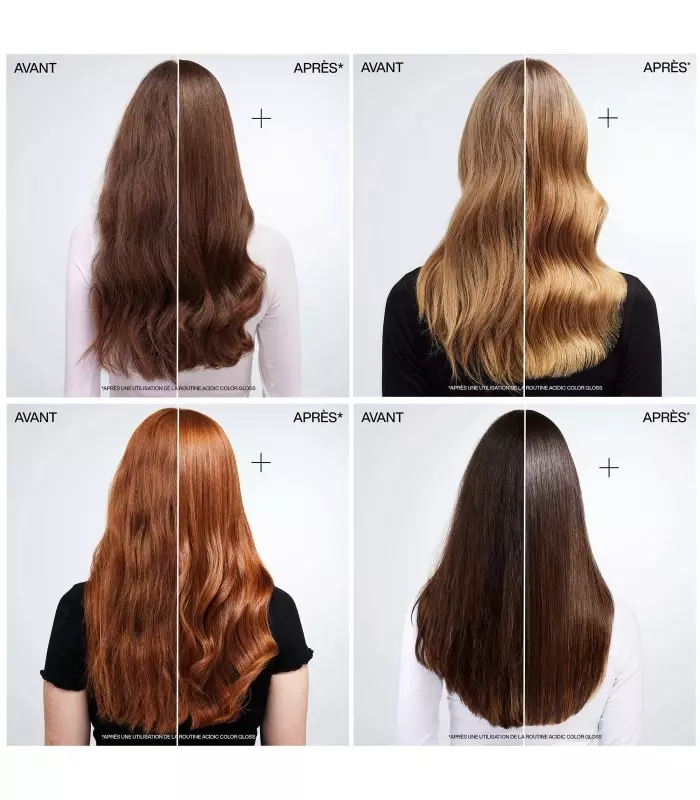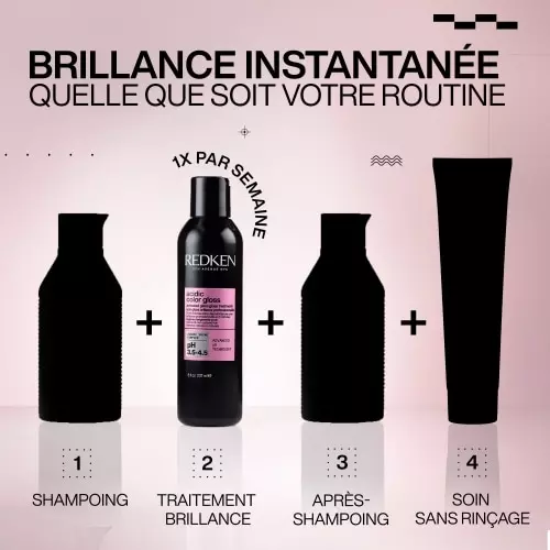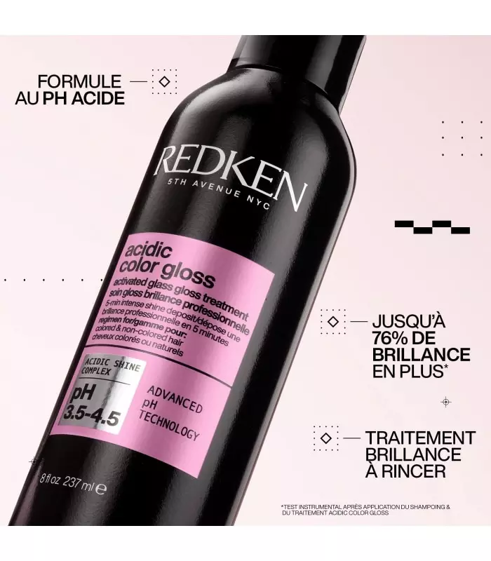 Le traitement Acidic Color Gloss Soin Gloss Brillance Professionelle de Redken est un traitement lustrant professionnel à domicile qui conditionne en profondeur et ajoute une brillance intense au niveau moléculaire pour les cheveux colorés. Une formule au pH équilibré avec de l'acide citrique et de l'huile d'abricot, cette formule ultra-acide préactivée aide à sceller la cuticule et à fixer la brillance comme du verre jusqu'à 3 jours et +76% de cheveux plus brillants**. Ce traitement lustrant laisse les cheveux revitalisés. Utiliser comme routine de soins capillaires complète avec le shampooing Acidic Color Gloss, l'après-shampooing et le traitement sans rinçage Heat Protection.
