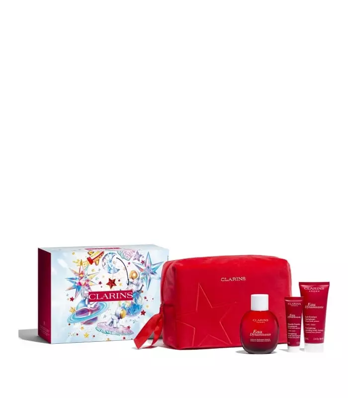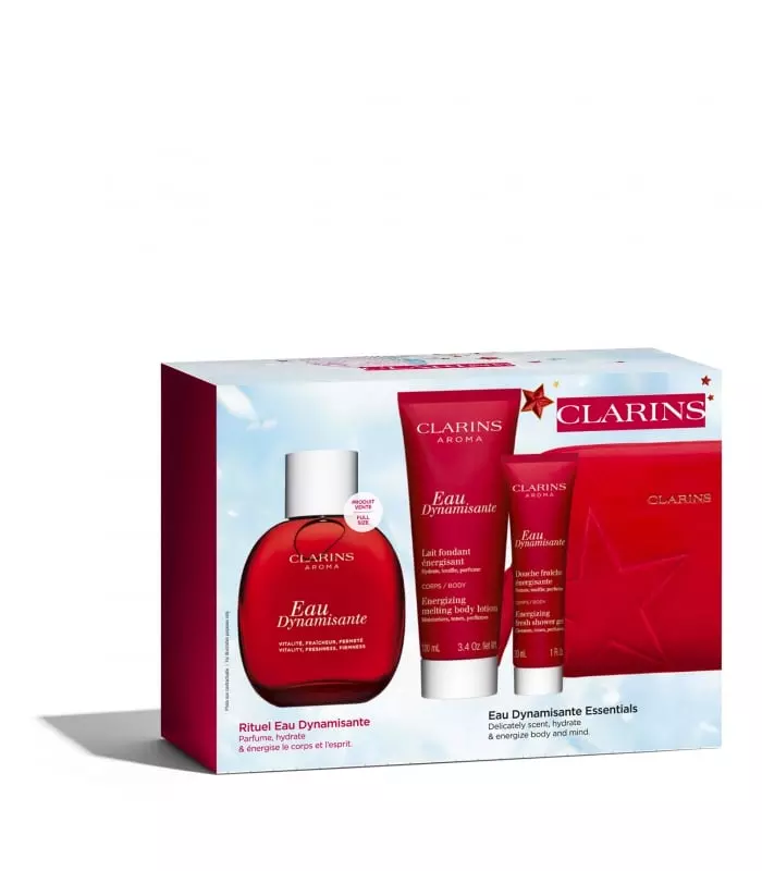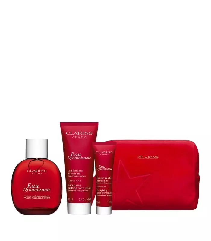 Ce coffret réunit la mythique Eau Dynamisante, la toute première Eau de Soin Clarins, et deux soins corps au parfum vivifiant : un lait hydratant corps à l'extrait de kalanchoé officinal bio et un gel douche enrichi en extrait d'aloe vera. Ce Rituel Énergie parfume, énergise et tonifie le corps et l’esprit. Il est parfait pour bien commencer la journée ou lutter contre un coup de fatigue passagère.