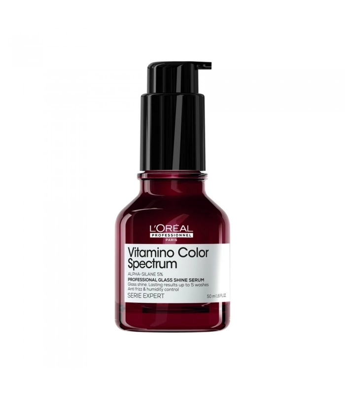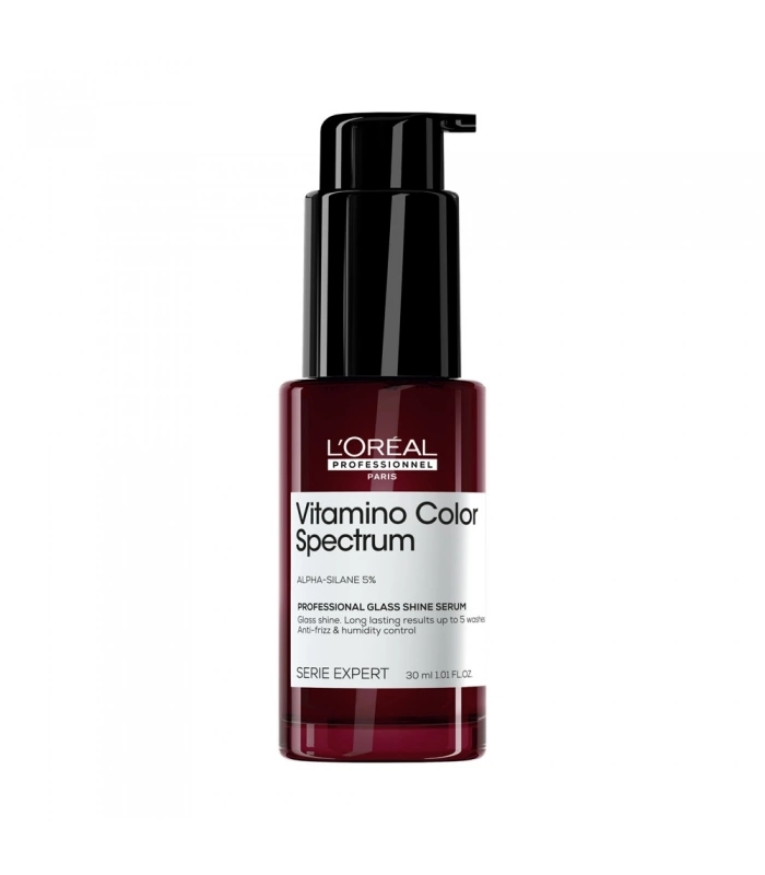 Le Sérum Concentré Brillance Miroir Vitamino Color Spectrum de L'Oréal Professionnel est enrichi de 5% d'Alpha-silane. Il fournit une brillance instantanée et des résultats durables jusqu'à 10 lavages*. Formulé sans eau, l'alpha-silane est un ingrédient de soin actif qui crée une couche protectrice à la surface de la fibre capillaire lorsqu'il est activé par la chaleur. Résultat : - Protection des cheveux colorés contre les dommages causés par les UV. - Effet anti frisottis jusqu'à 72H ** - Anti humidité (jusqu'à 80% d'humidité dans l'air**). - Protection contre la chaleur jusqu'à 230°C**. Les cheveux sont instantanément plus hydratés, lissés et plus doux et le résultat dure jusqu'à 10 shampoings*. Préserve la couleur intense du jour 1 jusqu'à 100 jours.*** Le résultat sur les 5 dimensions de la couleur**** : 1. Brillance : une brillance ultra intense. 2. Saturation : une couleur riche et vibrante. 3. Contraste : une profondeur optimale entre les différentes nuances. 4. Ton: les reflets indésirables sont neutralisés. 5. Luminosité : le niveau de clarté ou d'obscurité est bien préservé.