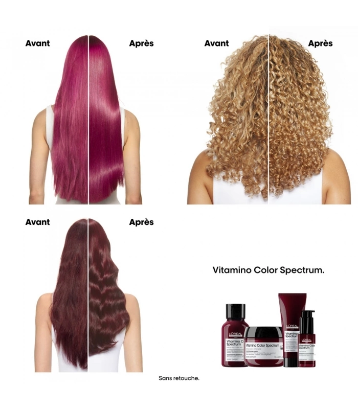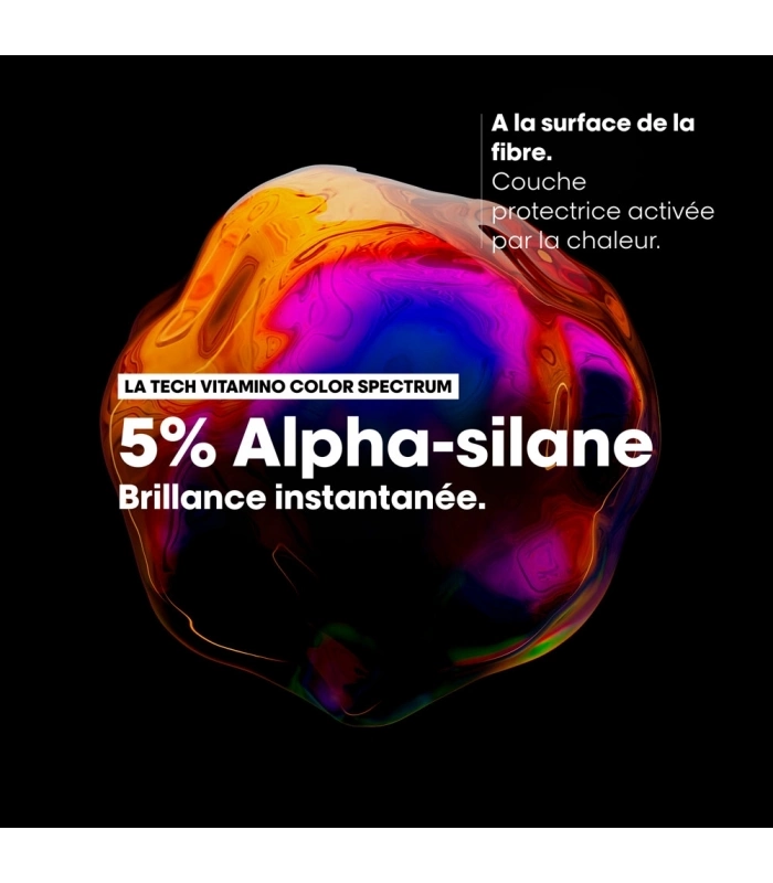 *Sur de multiples attributs de cheveux, tests instrumentaux. **Tests instrumentaux .***Test instrumental après utilisation de la routine Vitamino Color Spectrum. ****Test instrumental avec la routine complète Vitamino Color Spectrum après 4 semaines. Brillance instantanée et des résultats durables jusqu'à 10 lavages*. Formulé sans eau, l'Alpha-silane est un ingrédient de soin actif qui crée une couche protectrice à la surface de la fibre capillaire lorsqu'il est activé par la chaleur. Résultat : - Protection des cheveux colorés contre les dommages causés par les UV. - Effet anti frisottis jusqu'à 72H ** - Anti humidité (jusqu'à 80% d'humidité dans l'air**). - Protection contre la chaleur jusqu'à 230°C**. Les cheveux sont instantanément plus hydratés, lissés et plus doux et le résultat dure jusqu'à 10 shampoings*. Préserve la couleur intense du jour 1 jusqu'à 100 jours.*** Le résultat sur les 5 dimensions de la couleur**** : 1. Brillance : une brillance ultra intense. 2. Saturation : une couleur riche et vibrante. 3. Contraste : une profondeur optimale entre les différentes nuances. 4. Ton: les reflets indésirables sont neutralisés. 5. Luminosité : le niveau de clarté ou d'obscurité est bien préservé.