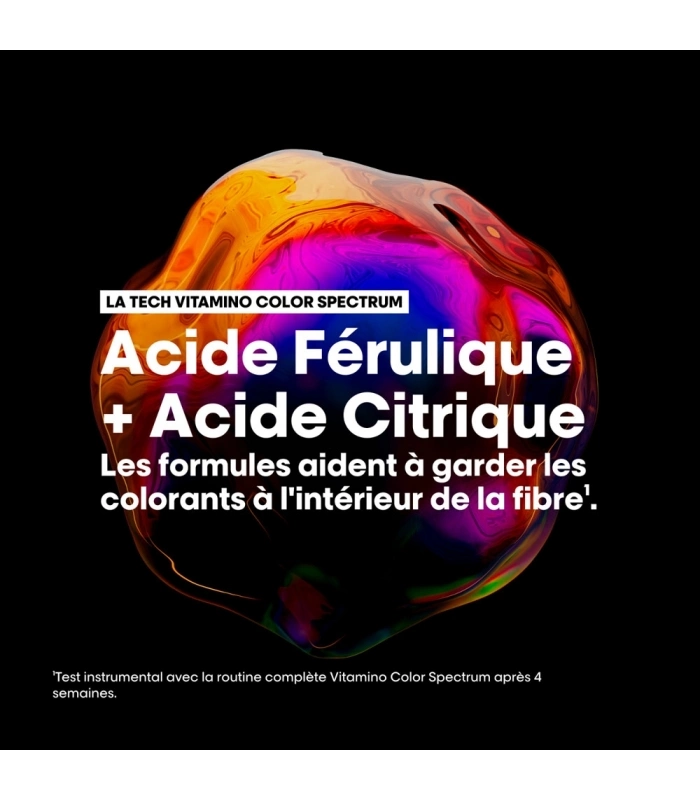 Le résultat sur les 5 dimensions de la couleur** : 1. Brillance : une brillance ultra intense. 2. Saturation : une couleur riche et vibrante. 3. Contraste : une profondeur optimale entre les différentes nuances. 4. Ton : les reflets indésirables sont neutralisés. 5. Luminosité : le niveau de clarté ou d'obscurité est bien préservé. La formule du shampoing présente une texture crémeuse luxueuse qui se transforme en une mousse dense une fois appliquée. Il nettoie la fibre en profondeur pour des cheveux instantanément nourris et plus forts. Les cheveux sont instantanément nourris et +96% plus forts.*** *Test instrumental après utilisation de la routine Vitamino Color Spectrum. **Test instrumental avec la routine complète Vitamino Color Spectrum après 4 semaines. ***Test instrumental après application du Shampoing Vitamino Color Spectrum. Conserve la couleur vive du jour 1 jusqu'à 100 jours.*