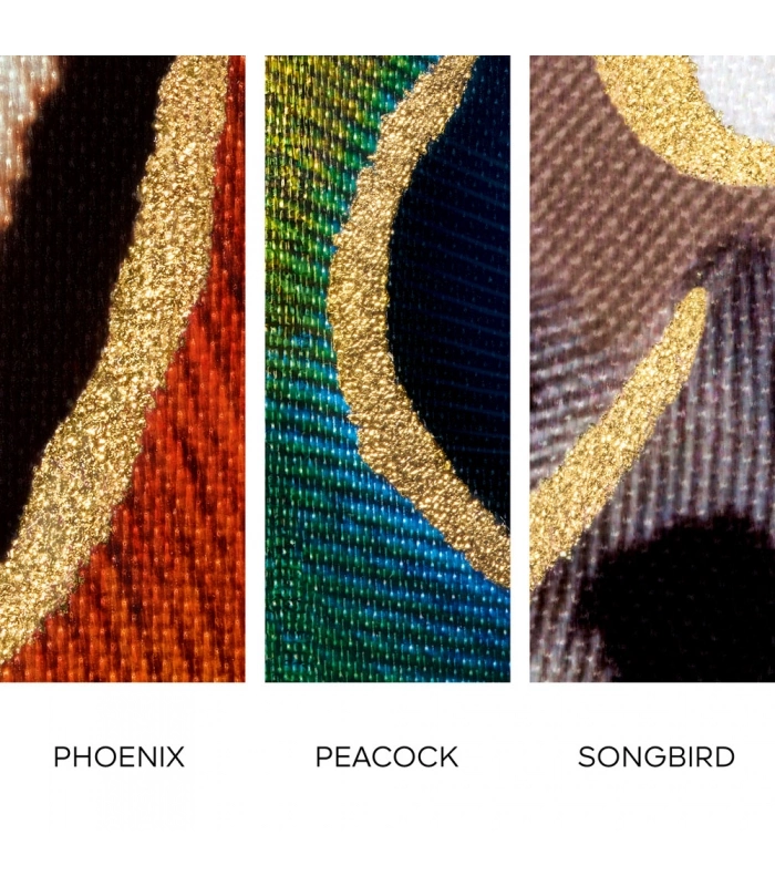 - Phoenix : emprunté aux plumes du phénix, le contraste saisissant du rouge vif et d’un beige moucheté délicat, relevé d’un soupçon de doré.