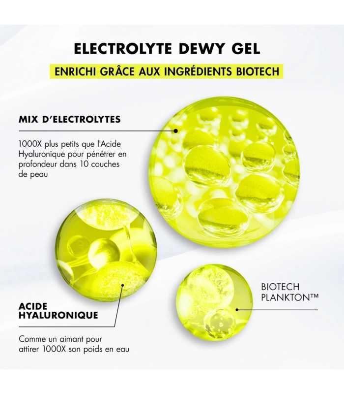 Inspiré par l'hydratation des sportifs, Aquasource+ Electrolyte Dewy Gel 100H est un gel hydratant léger formulé pour offrir jusqu'à 100 heures d'hydratation après une seule application¹. Enrichi de 7000 mg d'un mix d'Électrolytes, le supplément d'hydratation inspiré du fitness, et de 1000 mg de Hyalu B3, cette formule aide à combler visiblement les ridules en seulement 1 heure² et maintient l'hydratation de la peau au fil du temps. Les Électrolytes, étant 1000 fois plus petits que l'Acide Hyaluronique, agissent comme un propulseur d'eau pour que la formule soit rapidement absorbée pour une peau instantanément gorgée d'eau. Des études cliniques et consommateurs montrent des améliorations visibles sur la texture de la peau, la souplesse, et une hydratation longue durée de 100H dès la première utilisation. ¹Test instrumental sur 24 sujets. ²Évaluation clinique sur 40 sujets