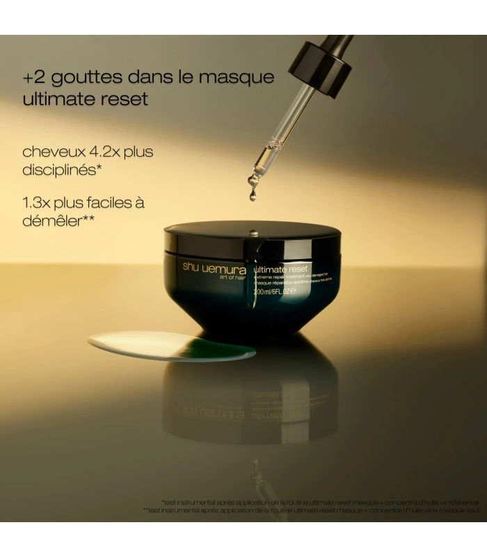 Le Traitement Duo Ultime : En associant le masque Ultimate Reset à 2 précieuses gouttes de ce concentré d'huile, vous créez un véritable traitement synergique. Cette alchimie parfaite révèle une efficacité décuplée, offrant une réparation immédiate de +99%****, transformant profondément la fibre capillaire. Vos cheveux deviennent 4.2x plus disciplinés*****, le démêlage est 1.3x plus facile******, et ils bénéficient d'un apport instantané et profond de nutrition. C'est la promesse de cheveux renforcés, doux et incroyablement lumineux.