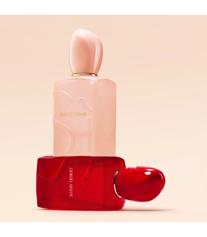 Le flacon signature de Sì se pare d’un éclat inédit. Son verre givré aux nuances nudes et délicates et son cabochon emblématique en forme de galet révèlent un rose doux, symbole d'élégance. Le design est sublimé par la signature « Sì », embossée en transparence dans le verre pour un fini sophistiqué.