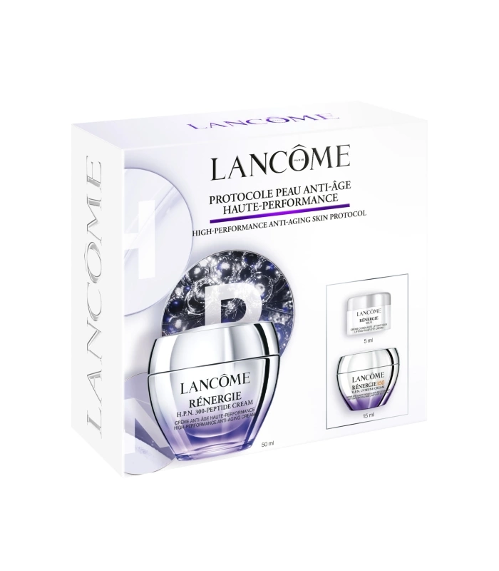 DÉCOUVREZ DANS CE COFFRET UN RITUEL RÉNERGIE ANTI-ÂGE EN 3 ÉTAPES 1. CIBLER avec la Crème yeux Rénergie Reconnue pour son action comblante, notre crème yeux innovante concentre 2 actifs anti-âge puissants dans une texture soyeuse spécifiquement formulée pour le contour de l’œil. Elle agit sur les 3 principaux signes de vieillissement du regard : les rides, la perte de fermeté et les cernes. 2. TRAITER avec la Crème H.P.N. 300-Peptide. Notre crème anti-âge #1 concentre plus de 300 types de peptides avec de l’acide hyaluronique et de la niacinamide pour régénérer la peau aussi vite qu’une peau plus jeune.