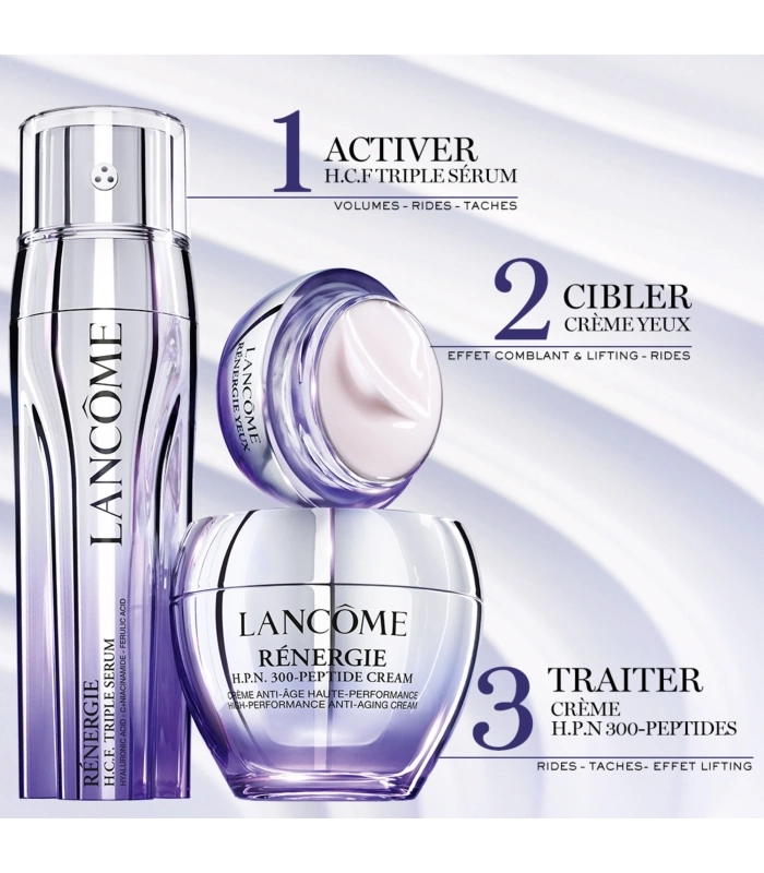 1. CIBLER avec la Crème Rénergie Yeux. 2. TRAITER avec la Crème Rénergie H.P.N. 300 Peptide. 3. PROTÉGER avec la Crème Rénergie H.P.N. UVMUNE SPF50