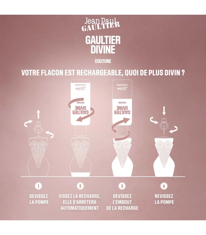 Votre parfum Gaultier Divine Couture est rechargeable en quatre étapes. Un geste écologique, simple et puissant ; à l’image de celle qui le porte.