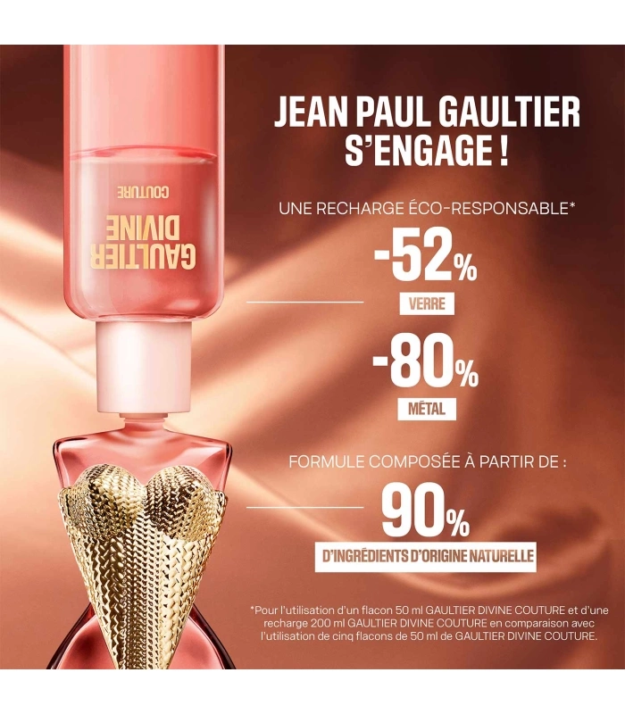 Gaultier Divine Couture Recharge 200ml Une recharge écologique dotée d’un système dévissable auto-stop. Jusqu’à 52% de verre et 80% de métal en moins* en faveur de l’environnement. Un geste responsable, fidèle à l’allure Gaultier : affirmée, élégante, consciente.