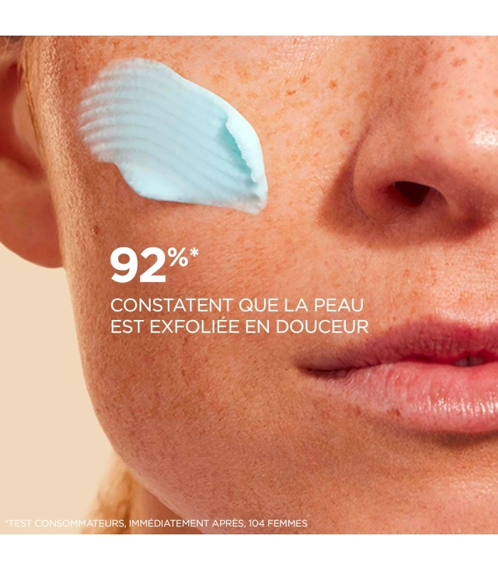 Apply the exfoliator once or twice a week, in the morning or evening. Warm a small amount of product between your hands and apply to your clean, damp face and neck. Massage gently without rubbing or pressing, avoiding the eye area. Then rinse with water.