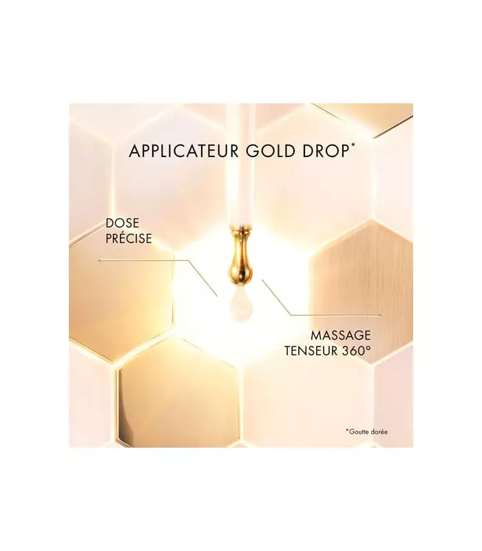 Its unique Gold Drop** applicator with a metallic ball for a fresh effect delivers a precise dose of serum for an exclusive 360° tensing and relaxing massage, a technique appreciated by 100% of women***.
