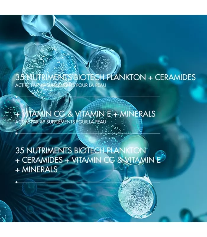Its trace element enriched formula concentrates the equivalent of 5000 litres of thermal spring water* - a veritable cocktail of hydrating and revitalising amino acids, vitamins E, C and B5 and fortifying Plankton of Life™.