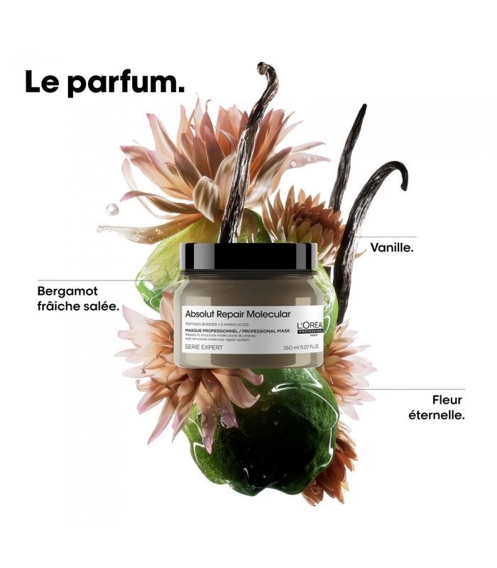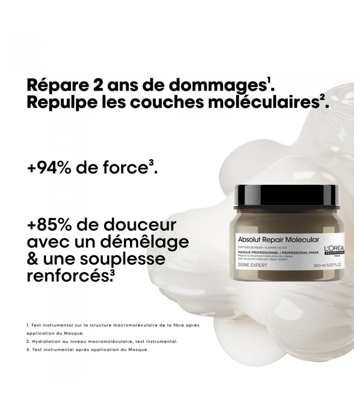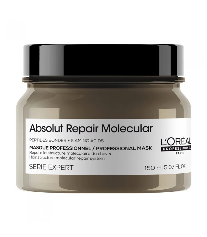 [SCIENTIFIC DISCOVERY - MOLECULAR REPAIR] When hair is damaged, its molecular structure, made up of peptides, is affected. Most peptides are too large to penetrate to the heart of the hair fibre, making the damage almost irreversible. Scientific discovery, Absolut Repair Molecular. Repairs 2 years of damage*. For the first time, L'Oréal Advanced Research has succeeded in breaking down peptides and reinjecting their components separately into the fibre**. Once inside, they reform and rebuild the molecular structure of the hair***. [PATENTED TECHNOLOGY] The highly concentrated Absolut Repair Molecular Professional Concentrate Mask with Peptide Binder + 5 Amino Acids repairs 2 years of damage* and replumps hair's molecular layers****. Hair is 94% stronger***** with enhanced detangling & suppleness*****, and +85% softer*****. [PROFESSIONAL FORMULA] Tested and approved by hairdressers. Its silky, creamy texture inspired by skincare is immediately absorbed by the hair fibre, providing intense care and repair without ever weighing it down. [RECOMMENDED FOR ALL TYPES OF DAMAGED HAIR] Mask for all types of damaged to very damaged hair: coloured, bleached and natural. [CO-DEVELOPED WITH REPAIR PROS] This range was co-developed with 3 international repair experts: - Adina Pignatare @adina_pignatare from the US - Mike Julliard @loungecut from France - Barbara Rabelo @barbarabelo_ from Brazil [ASK FOR MOLECULAR CARE IN SALON] Next time you visit your salon, ask your hairdresser for long-lasting molecular care******.Absolut Repair Molecular protocol for molecular repair of the hair, repairing 2 years of damage in 1 application*. For stronger hair, restored elasticity & movement*******. *Instrumental test on the macromolecular structure of the fibre after application of Absolut Repair Molecular Mask. **Amino acids & peptide binder. ***Instrumental test after 7 applications of Shampoo + Rinse-Off Serum + Absolut Repair Molecular Mask. **** Hair is plumped up thanks to macromolecular hydration. Instrumental test after applying the Absolut Repair Molecular mask. ***** Instrumental test after application of the Absolut Repair Molecular mask. ******Instrumental test on the macromolecular structure of the fibre after application of the Absolut Repair Molecular Pre-Treatment + Shampoo + Rinse-Off Serum + Mask + Leave-On Mask. *******Consumer test after application of Pre-Treatment + Shampoo + Rinse-Off Serum + Absolut Repair Molecular Mask.