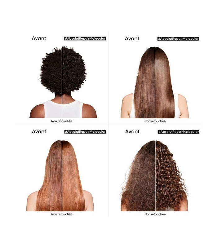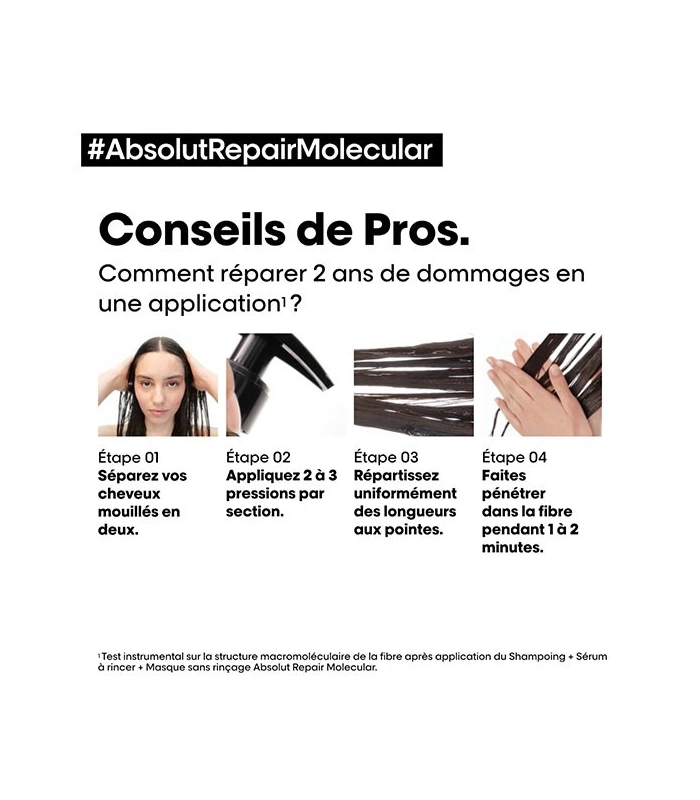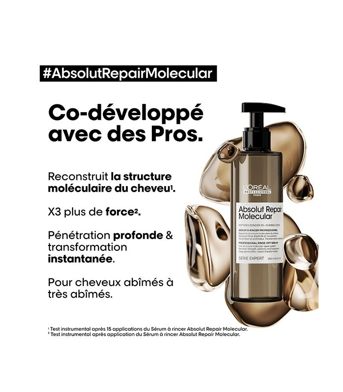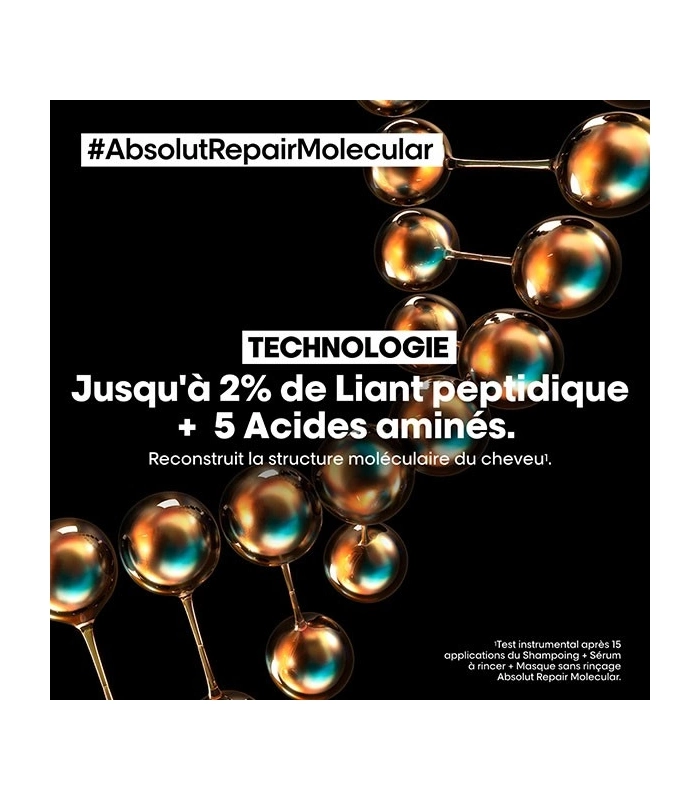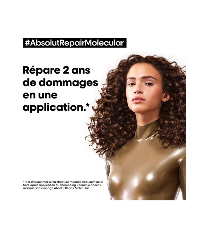 Instantly repairs hair fibre after 2 years of damage. Hair is intensely nourished from within. More concentrated than a traditional mask. Penetrates deeply and instantly into the heart of the fibre. Hair is stronger and regains better elasticity. Lightweight treatment that does not weigh hair down. Makes detangling easier. Ten times more shine Hair regains its health Suitable for all types of damaged, fragile, and unhealthy hair Delicate fragrance with notes of bergamot, fleur de sel, and sandalwood [SCIENTIFIC DISCOVERY - MOLECULAR REPAIR] When hair is damaged, its molecular structure composed of peptides breaks down. Damaged hair becomes rubbery and loses its movement. Most peptides, composed of amino acids and peptide binders, are too large to be reintroduced, making damage of this magnitude almost irreversible. Scientific discovery: Absolut Repair Molecular. Repairs 2 years of damage in one application*. For the first time, L'Oréal Advanced Research has succeeded in breaking down peptides to reintroduce their components separately into the fibre**. Once inside, they reform and rebuild the hair's molecular structure***. [PATENTED TECHNOLOGY] More than just surface repair, we act at the heart of the molecule. Absolut Repair Molecular Rinse-Out Serum is highly concentrated with 2% peptide binder + 5 amino acids.