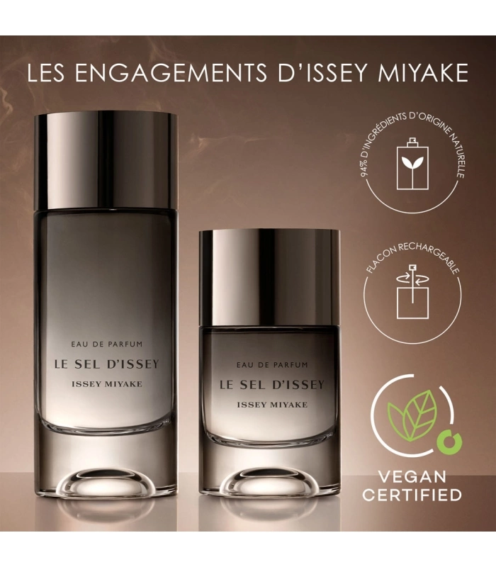 Le Sel d’Issey Eau de Parfum is a fragrance with infinite movement, expressing the encounter between the powerful freshness of the sea and the warm intensity of the earth. Evoking the sea pole, a vibrant salty accord combines with seaweed and naturally sourced oak moss. The earth pole reveals the sensuality of incense notes and a naturally sourced amber note combined with upcycled cedar wood. An intense fragrance with an enveloping and sensual elegance. Sel d'Issey Eau de Parfum is vegan, contains 94% natural ingredients, and is made from 100% French alcohol.