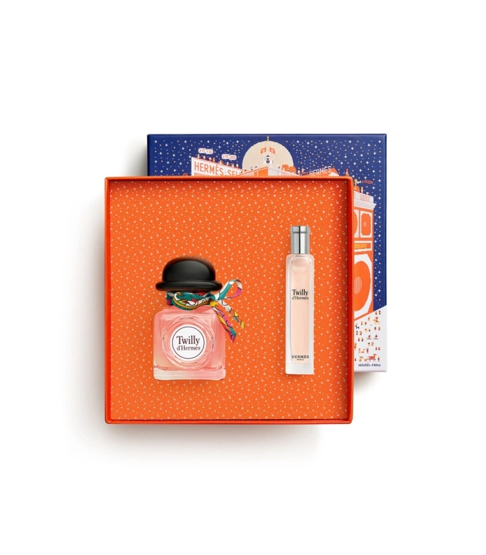 The box set contains a 50 ml bottle of Twilly d'Hermès Eau de Parfum and a 15 ml bottle of Twilly d'Hermès Nomade Eau de Parfum.