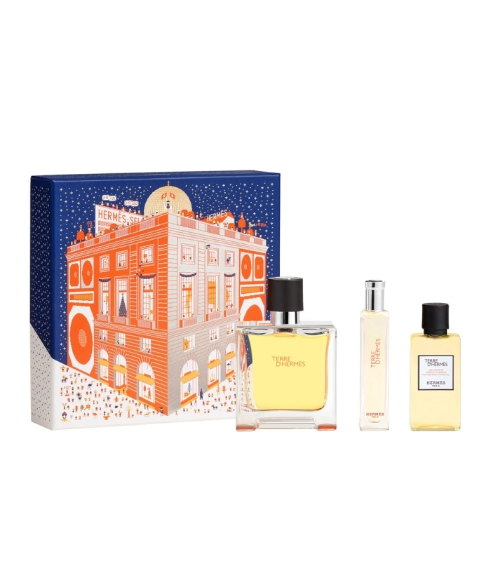 The box set contains a 75 ml bottle of Terre d'Hermès fragrance, a 15 ml bottle of Terre d'Hermès nomade fragrance and a 40 ml bottle of shower gel for body and hair.