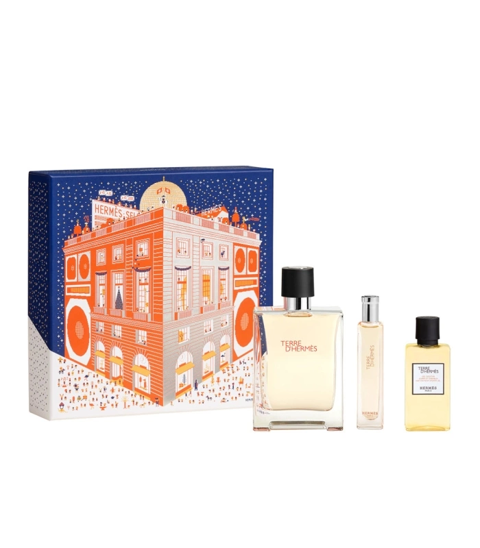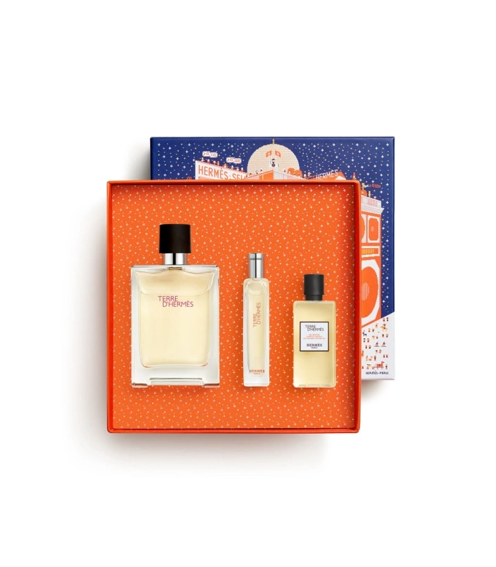 The gift set includes a 100 ml bottle of Terre d'Hermès Eau de Toilette, a 15 ml bottle of Terre d'Hermès Nomade Eau de Toilette and a 40 ml bottle of shower gel for body and hair.