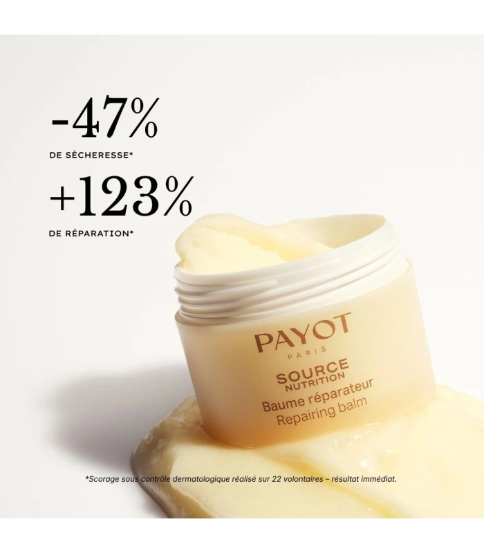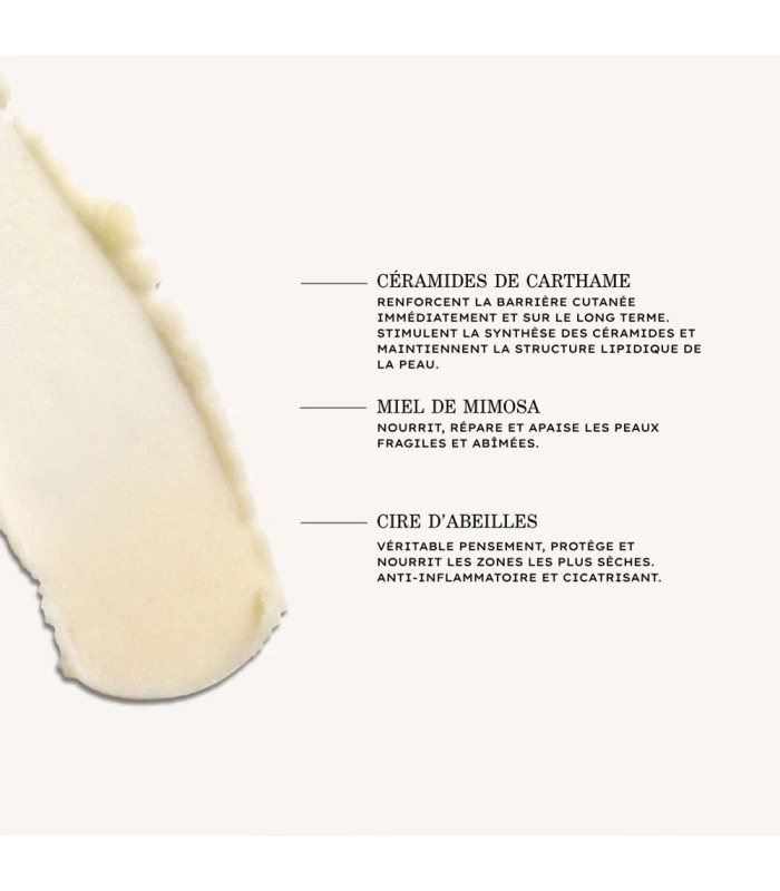 This multi-purpose balm with a honey-wax texture melts instantly on the skin. Ultra-nourishing, repairing, and protective, it acts like a bandage and becomes an ally