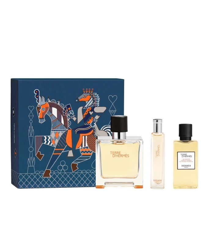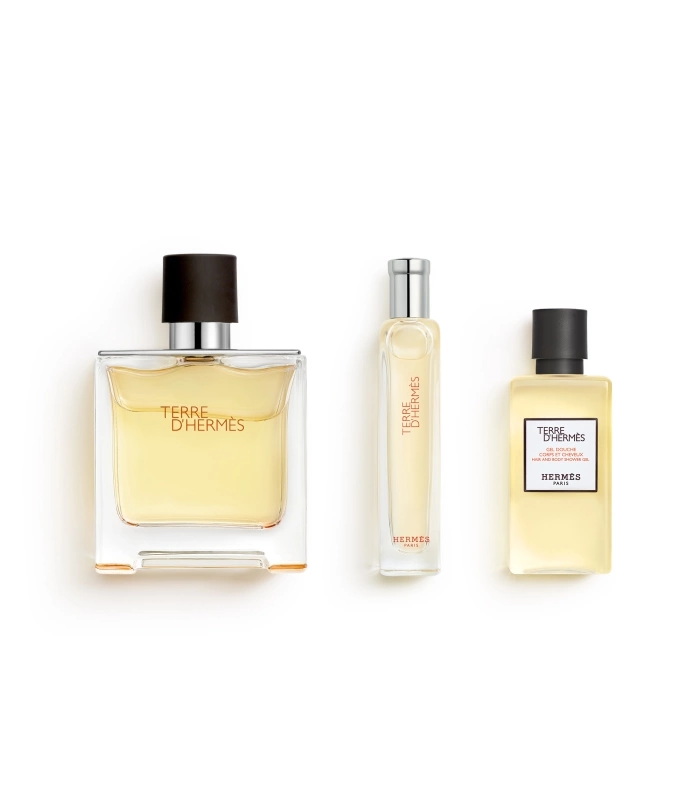 The gift set includes a 75ml Terre d’Hermès fragrance, a 15ml Terre d’Hermès Nomade fragrance, and a 40ml body and hair shower gel.