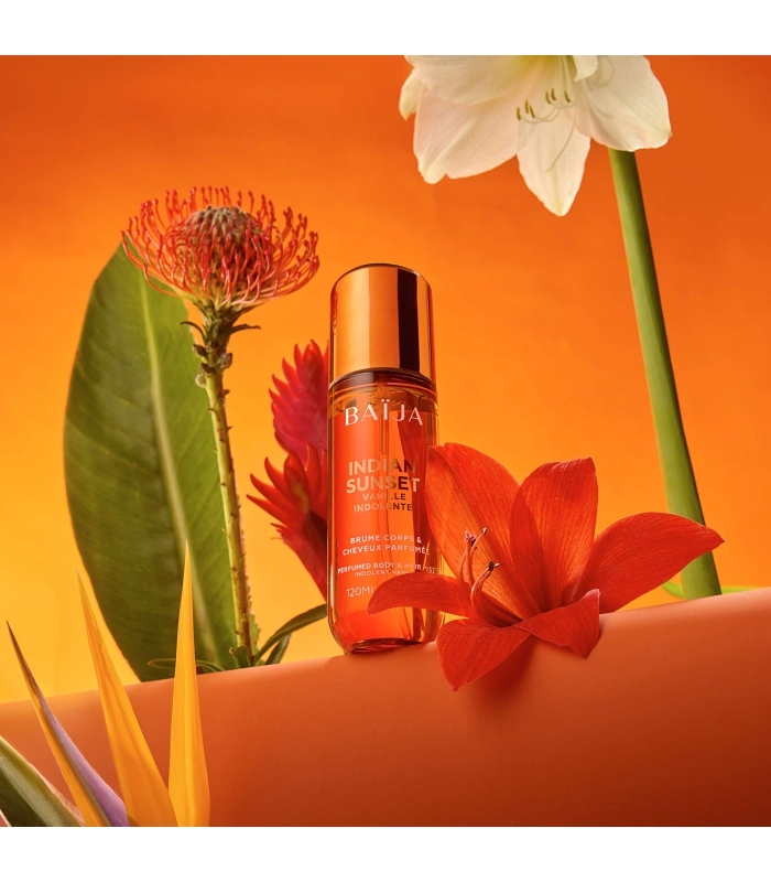 A hint of Indian summer hangs in the air. The sun is setting, its glow still warming the air. The air is filled with the last scents of summer. Time stretches out, languidly, and the shadows lengthen. Summer lingers without haste. All is peaceful. INDIAN SUNSET is a peaceful interlude. The rosy flowers evoke the tenderness of the fading day, the languid vanilla stretches out nonchalantly, and the twilight amber casts a golden warmth upon the skin. It is the scent of inner calm, of letting go, of a summer that refuses to fade away.