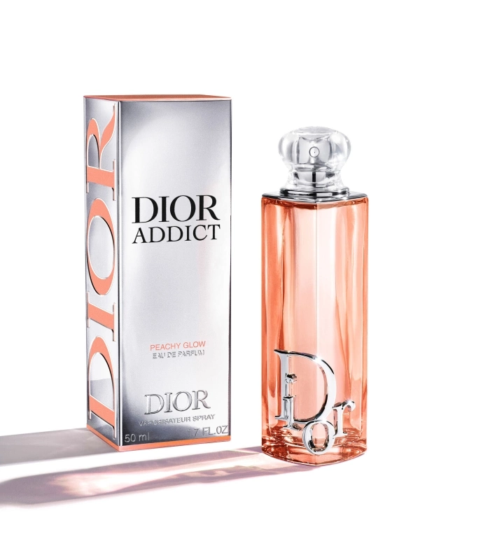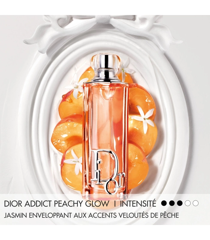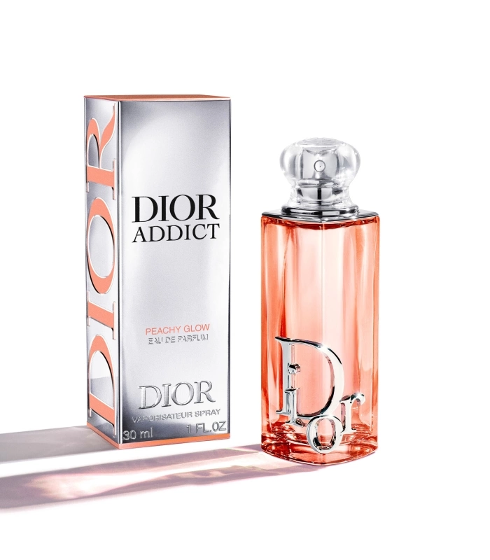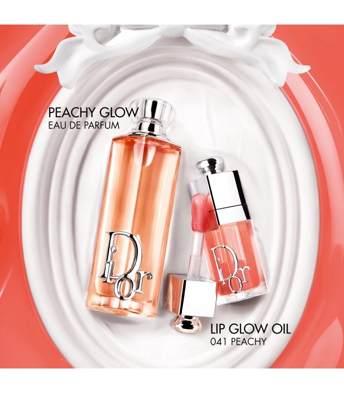 Spray Dior Addict Peachy Glow onto your pulse points – the neck and wrists. Pair it with Dior Addict Lip Glow Oil 041 Peachy, the lip oil with a “juicy¹” finish.